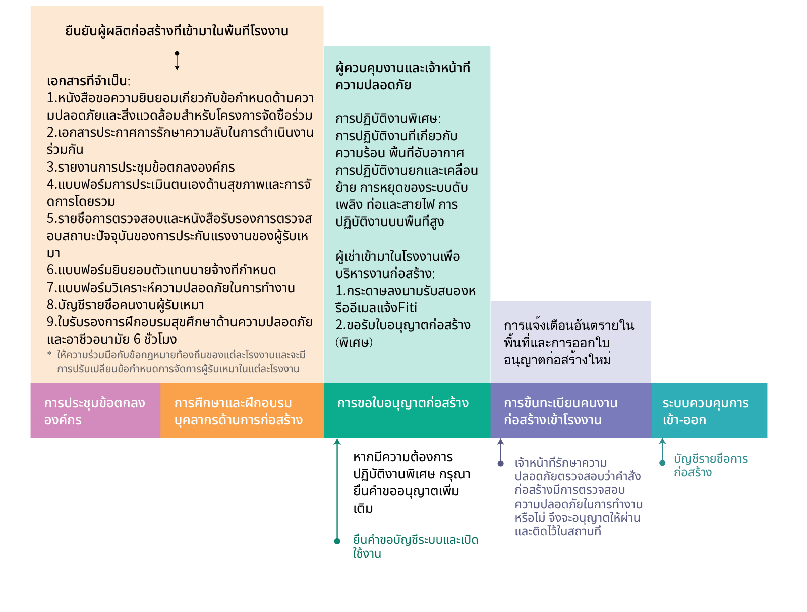 เรามุ่งมั่นในการสร้างความปลอดภัยในสถานที่ทำงานและปฏิบัติตามข้อกำหนดด้านสิ่งแวดล้อม เพื่อจุดประสงค์นี้ เราได้ตั้งข้อบังคับด้านความปลอดภัย อาชีวอนามัย และสิ่งแวดล้อม (SHE) สำหรับผู้รับเหมา โดยระบุการดำเนินงานที่มีความเสี่ยงสูงซึ่งต้องควบคุมอย่างเข้มงวด ผู้รับเหมาจำเป็นต้องมีใบรับรองและคุณสมบัติที่กฎหมายกำหนด และเราร่วมมือกับผู้รับเหมาเพื่อดำเนินมาตรการความปลอดภัยในสถานที่ทำงานและปกป้องสิ่งแวดล้อมอย่างมีประสิทธิภาพ