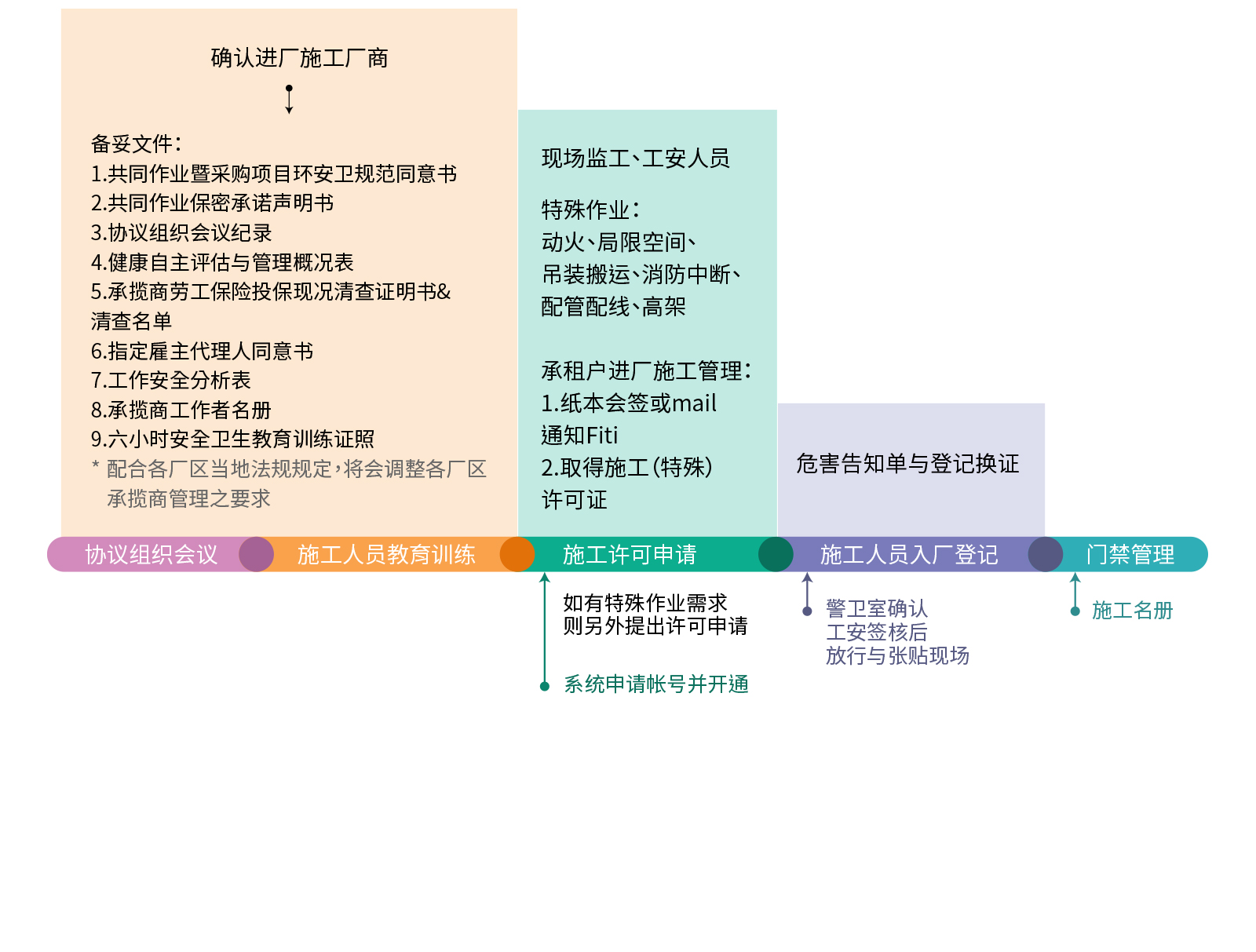 本公司致力于工作场所安全防护及对环保之相关要求,订定承揽商安全卫生环保规章,定义高风险作业进行重点管制,并要求承揽商依法提供专业技术人员技能认证,与承揽商共同落实工作场所安全防护。